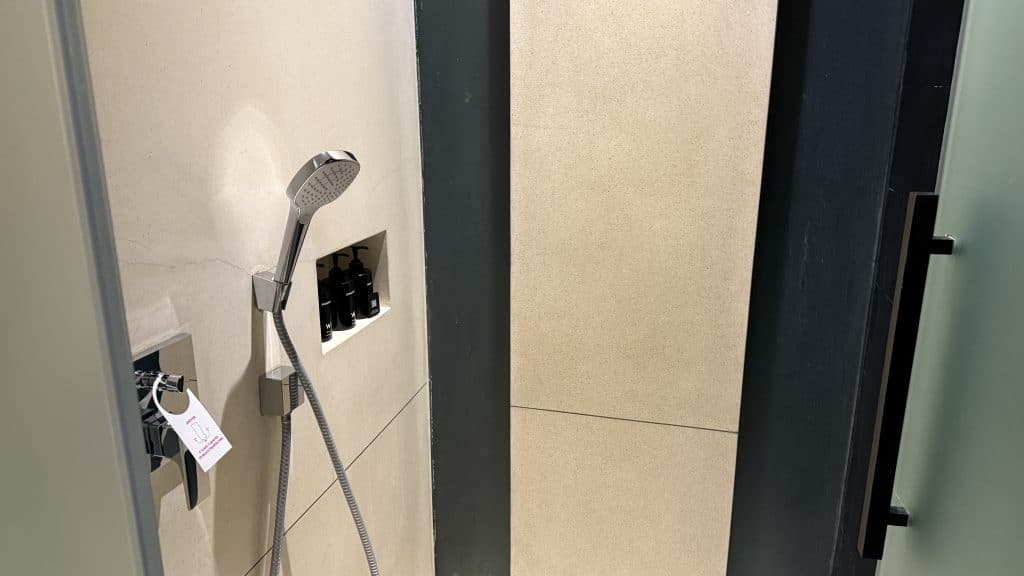 Gegenüber von dieser findet man die Dusche, die einem Hotel auf diesem Niveau angemessen ist.