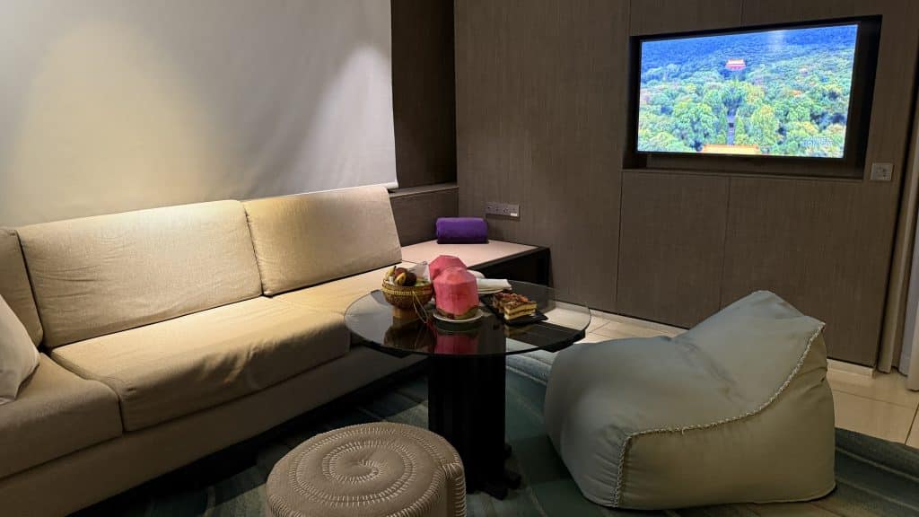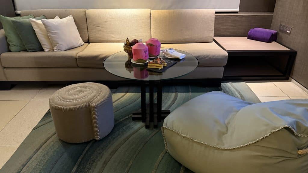 Schreitet man vom Schlafbereich nach rechts, steht man im durch den offenen Schnitt der Villa direkt sichtbaren Wohnbereich, der neben einem Hocker und einem Sitzsack insbesondere von einem Sofa dominiert wird. Einen Tisch, auf dem beim Check-in das Willkommensgeschenk bereitstand, gibt es natürlich auch.