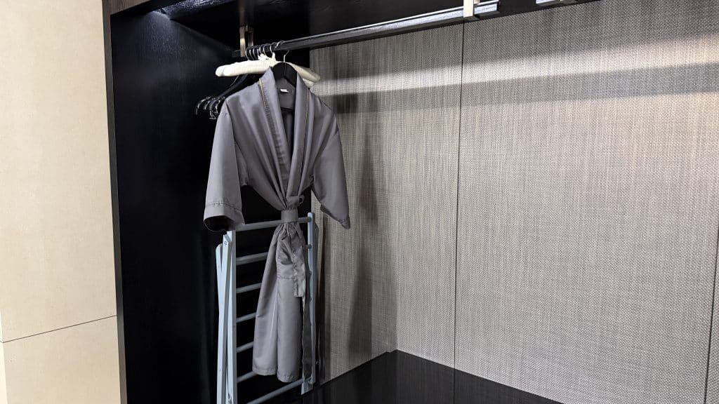 Als Raumtrenner zwischen dem Schlafzimmer und dem Badezimmer dient dabei ein sehr großer offener Kleiderschrank, in dem man problemlos auch zwei oder drei Koffer sowie einiges an Kleidung unterbringt.