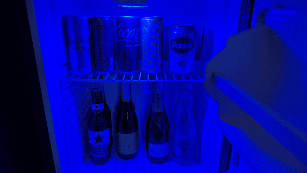 Auf der gegenüberliegenden Seite findet in einem Schrank die ziemlich gut ausgestattete Minibar statt, an der man sich gegen Aufpreis bedienen kann.