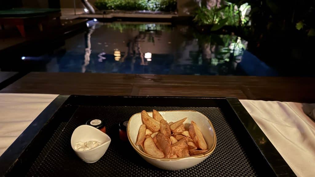 Einen Mini-Test kann ich in dieser W Bali Seminyak Bewertung auch zum Room Service geben, denn bei unserer späten Ankunft wollten wir noch einen kleinen Snack essen. Die bestellten Kartoffelecken kamen dabei trotz des weiten Wegs zum Restaurant schnell und waren lecker.
