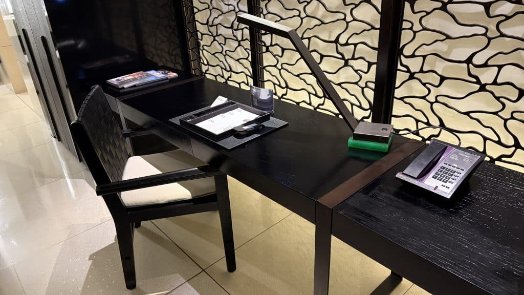 Ein Gang hinter dem Bett verbindet den Wohnbereich auch mit dem Badezimmer, wobei der Raum hier klug genutzt ist, findet man hier doch einen lang gezogenen Schreibtisch mit einem Stuhl. Hier befinden sich auch einiges weiteres Informationsmaterial zum Hotel.