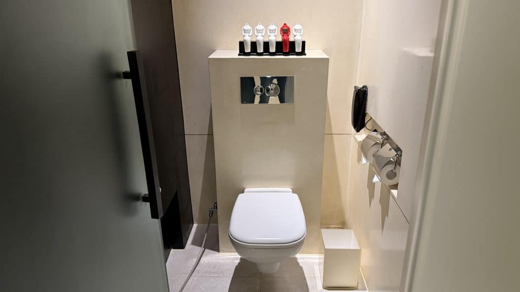 Die „privateren“ Bereiche des Badezimmers befinden sich auf der gegenüberliegenden Seite. Über einen kleinen Gang gelangt man hier zur durch eine Milchglastür abgetrennten Toilette.