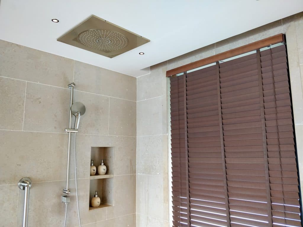 Zudem gibt es eine sehr großzügig gestaltete Dusche mit zwei Duschköpfen. Die Pflegeprodukte befinden sich dabei in Glasbehältnissen und sind von hoher Qualität.