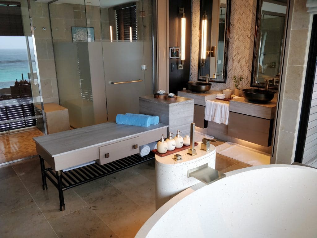 Danach folgt in meiner Waldorf Astoria Maldives Ithaafushi Bewertung das enorme Badezimmer der Villen im Waldorf Astoria Maldives Ithaafushi, das ebenfalls in vielerlei Hinsicht zu beeindrucken weiß.