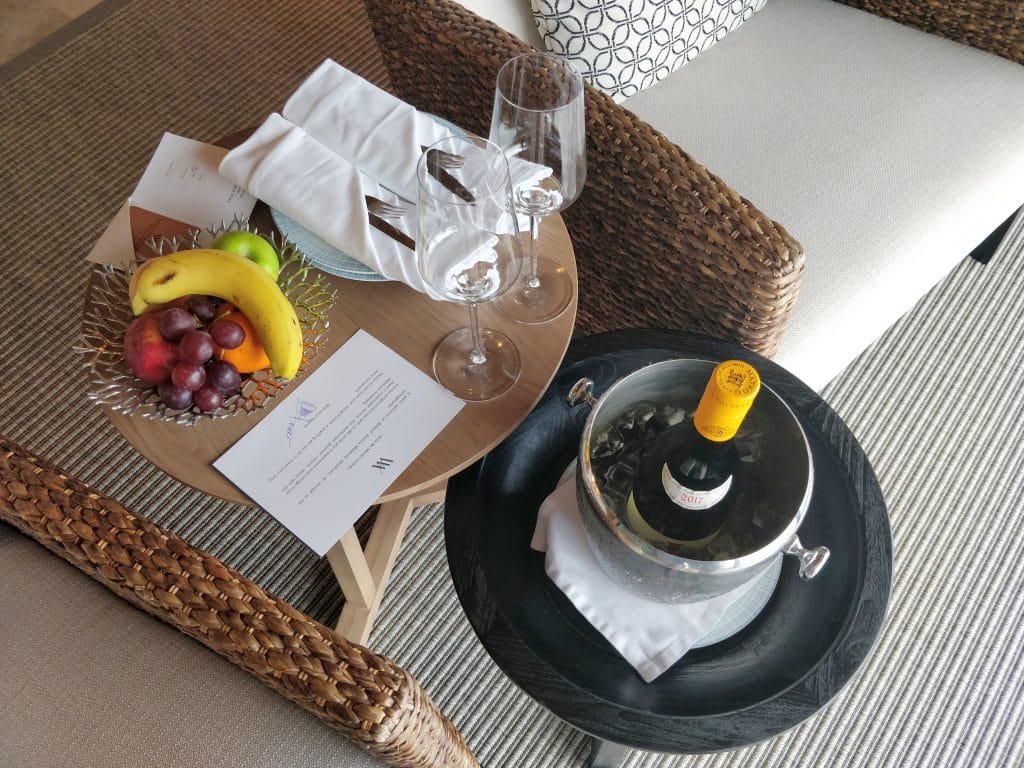 Auf dem Tischen wartete bei der Anreise auch bereits das Willkommensgeschenk bestehend aus Obst (dieses wurde immer wieder aufgefüllt) sowie einer Flasche Wein.