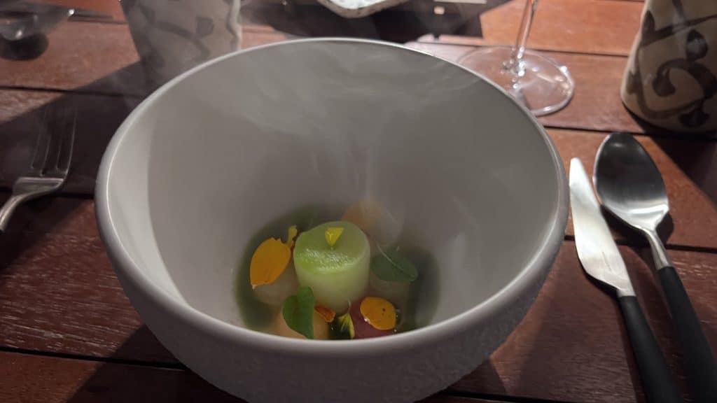 Am zweiten Abend hatte ich noch eine Geschmacksreise, die auf dem nachhaltigen Konzept “Soil-to-Soul” beruht. Hier werden alle Zutaten im eigenen Garten angebaut und alles dieser Produkte verarbeitet – von frischer Zubereitung bis zu eingelgten Gemüsen. Es wird ausschließlich vegetarisch empfohlen und gekocht, aber darauf hingewiesen, dass auf ausdrücklichen Wunsch des Gastes auch eine Eiweißbeilage serviert werden kann.