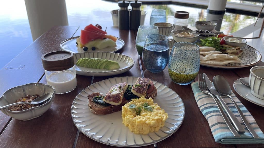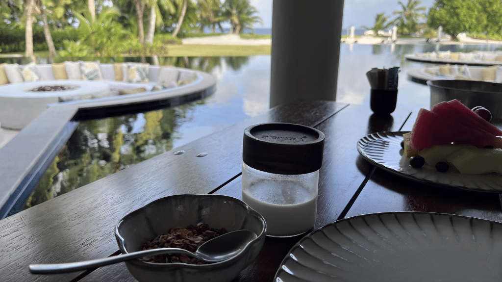 Im Generellen bin ich ein großer Fan von á la carte Frühstück, wenn denn die Serviceabläufe sitzen und bei der Ratio von Mitarbeitern auf Gäste nicht bereits eine lange Wartezeit vorprogrammiert ist. Dies war in diesem Fall auch sehr gut gelöst. Ob dies bei stärker belegtem Resort zu Herausforderungen führen kann, vermag ich nicht abschätzen. Für mich wirkte das Team recht eingespielt. Darüber hinaus hat mir besonders gut gefallen, dass frische, hauseigen produzierte Kokosjoghurts gereicht werden. Diese werden mit der Milch der Kokosnüsse der Insel angesetzt und einfach oder mit frischen Früchten gereicht – für mich ein super Start in den Tag.
