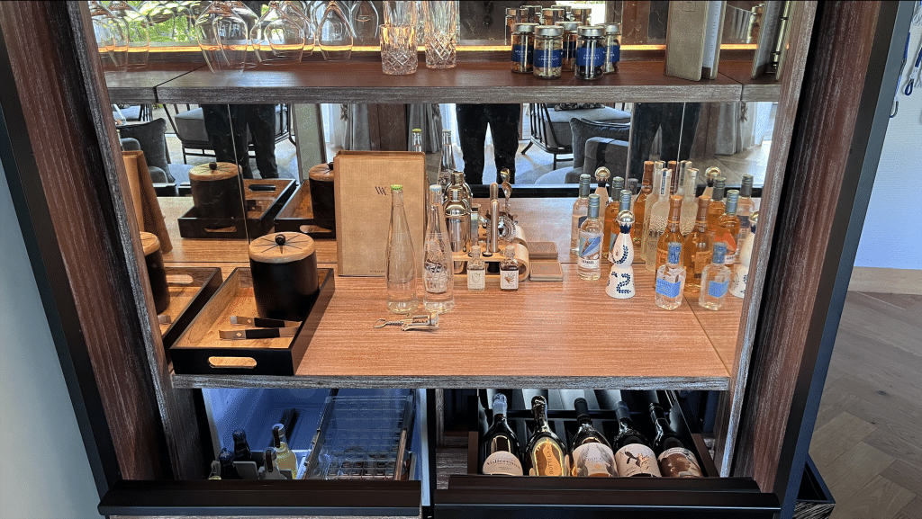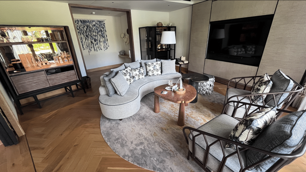 Der Wohnbereich umfasst eine moderne Couch und Sesselkombination, eine In-Villa Bar sowie eine Kaffestation. Hier wird neben Nespresso Kaffee sowie unterschiedlichen Tees eine große Auswahl an Softdrinks, aber auch alkoholischen Getränken gereicht. Besonders stolz ist man auf den lokalen Rum, es gibt aber auch Champagner. Wenn man also die Privatsphäre einer Villa schätzt und nicht an der Bar sitzen mag, kommt hier dennoch voll auf seine Kosten.