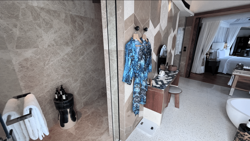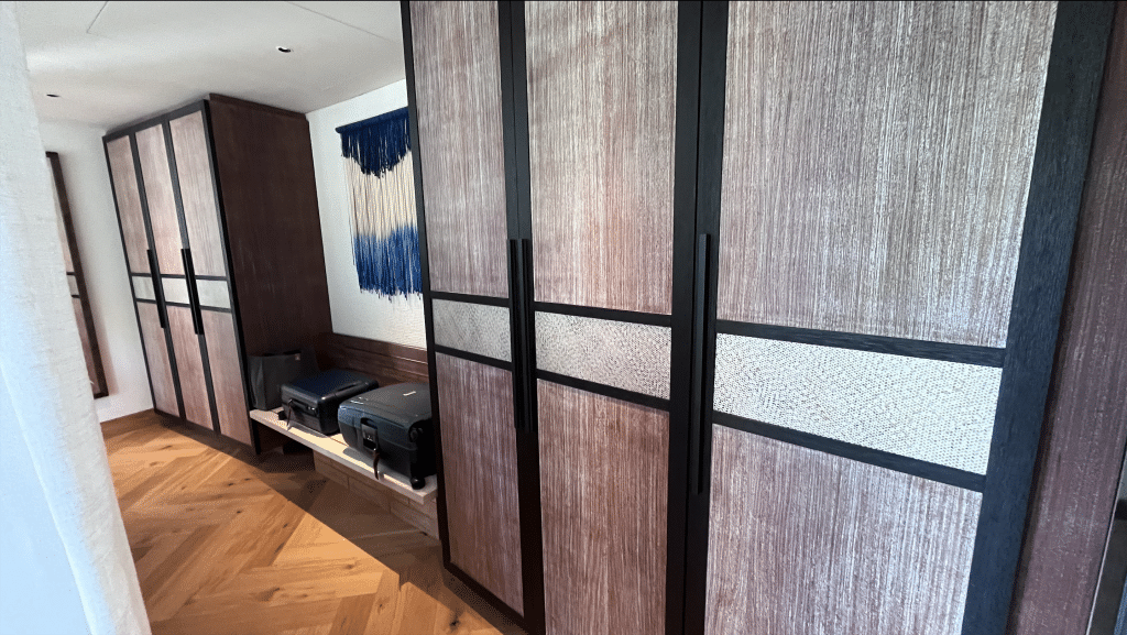 Aus meiner Sicht gut gemacht, versteckt sich der Ankleidebereich hinter dem Bett. Freilich kann es hier bei unterschiedlichen Schlafzyklen der Bewohner durch die Offenheit zum Bett und Schlafbereich zu Herausforderungen kommen, zumal die Belichtung hier etwas schwach ist, aber mir persönlich hat dies gut gefallen und ich habe reichlich Ablage- und Staufläche sowie ein Bügeleisen vorgefunden. Für mich persönlich, der zwar auch geschäftlich viel reist, ist ein Bügeleisen auch in Resorts wichtig, denn wer mag schon mit ungebügelten Hemden zum Dinner im tollen Restaurant sitzen? Selbstverständlich schätze ich auch den Wäscheservice, der angeboten wird, aber bei nur wenig Zeit oder kurzfristigen Entscheidungen zur Wahl des Dresses, ist es für mich einfach beruhigend, selbst schnell Hand anlegen zu können.