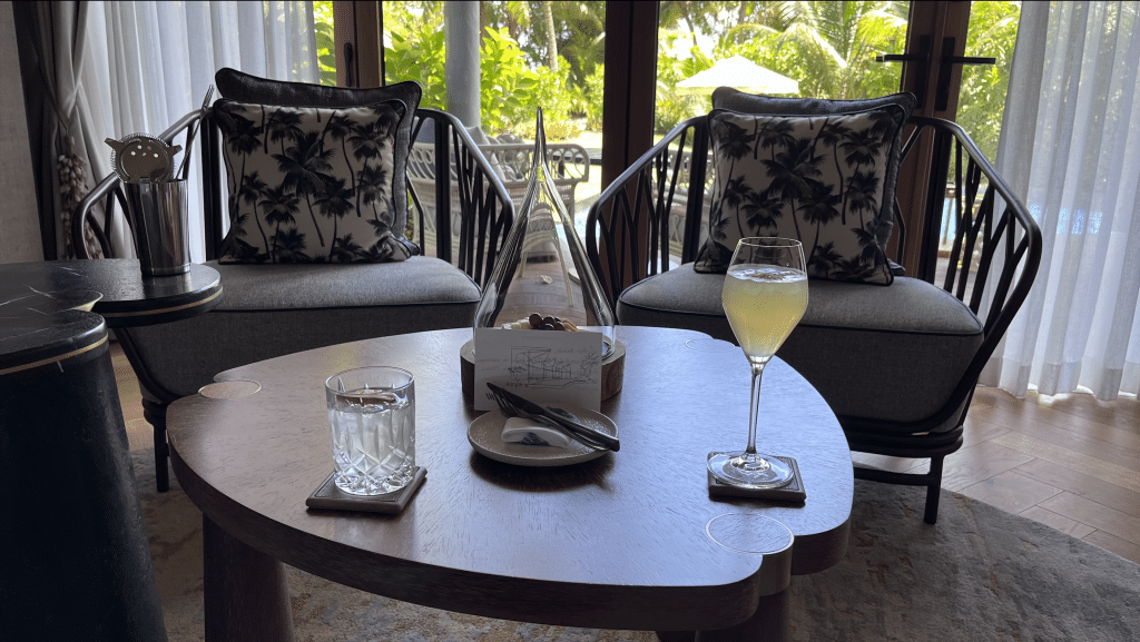 Im Wohnzimmer findet auch bei Einzug das Willkommensritiual statt. Für uns wurde zwei individuelle Cocktails vor unseren Augen zubereitet.