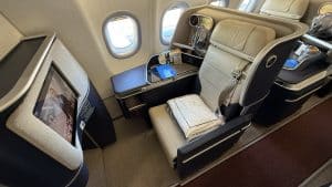 Was man bei diesem Produkt – das man so ähnlich etwa auch in der Finnair Business Class oder der EVA Air Business Class findet – bedenken sollte ist, dass man weder in der Mitte noch am Fenster so richtig nebeneinander sitzt und sich unterhalten kann – für Alleinreisende ist das Produkt entsprechend besser geeignet als für Paare. Ich persönlich finde die Sitze allerdings dennoch sehr angenehm, weil sie ein gutes Level an Privatsphäre bieten und gleichzeitig durch einen hohen Sitzkomfort überzeugen.