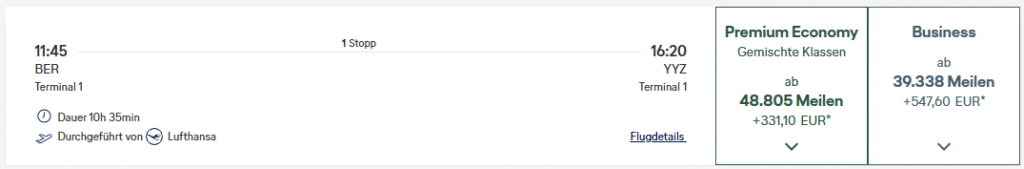 Besonders hervorzuheben ist bei einem ersten Blick auf das neue System, dass die neuen Award Flights in der Business Class erstaunlich günstig sind. Gut zeigt sich das bei Flügen an die nordamerikanische Ostküste. Bei einer beispielhaften Verbindung von Berlin nach Toronto werden hierfür sogar weniger als 40.000 Meilen fällig – erstaunlich ist dabei insbesondere, dass die Business Class bei fast allen beispielhaften Suchen günstiger ist als die Premium Economy Class: