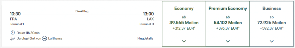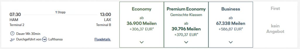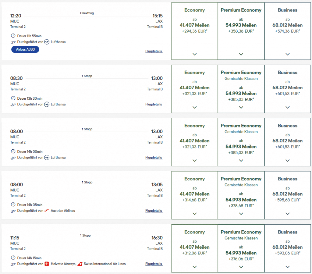 Hierbei spielt allerdings scheinbar keine Rolle, welche Verbindung man ab einem bestimmten Flughafen wählt. Wer in Frankfurt startet, bezahlt für den Prämienflug nach Los Angeles beispielsweise auch dann die aufgezeigten 72.926 Meilen, wenn er via Zürich oder München fliegt. Wer dagegen in München startet, zahlt für den Direktflug genauso viel wie für Umsteigeverbindungen über Frankfurt, Wien oder Zürich:
