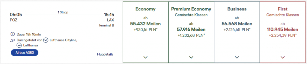 Entsprechend kann es sich zukünftig durchaus lohnen, bei Prämienflügen auch andere nahegelegene Airports in den Blick zu nehmen, um zu sparen. Das zeigt sich dabei insbesondere bei Flughäfen, die für besonders günstige bezahlte Tickets bekannt sind. Wer etwa ab Posen in Polen startet, bezahlt für die oben aufgezeigten Flüge nur 56.568 Meilen und selbst in der First Class werden hier nur 110.945 Meilen nach Los Angeles fällig (ab Deutschland immer mindestens 120.000 Meilen):