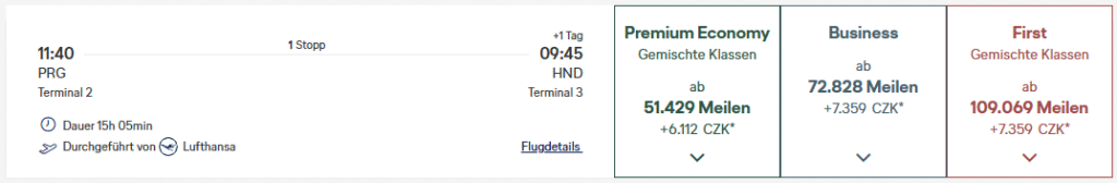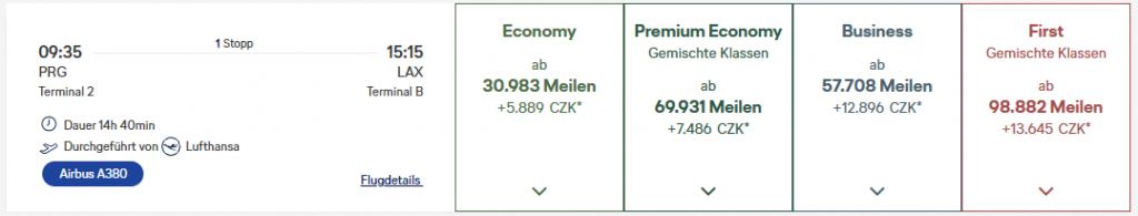 Sparen lässt sich auch auf dieser Strecke, wenn man nach Prag ausweicht (sowohl bei den Meilen als auch bei den Zuschlägen):
