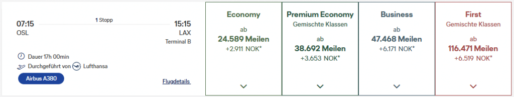 Wer dagegen besonders günstige Flüge in der Business Class sucht, der sollte einen Blick nach Oslo werfen. Hier gibt es die Business Class beispielsweise für gerade einmal 47.468 Meilen, während die First Class deutlich teurer ist: