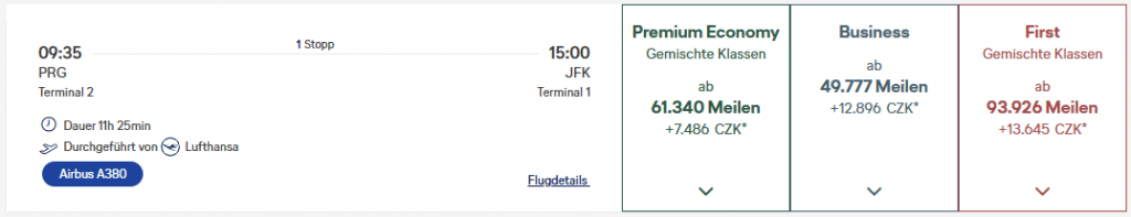 Sparen lässt sich gleichwohl, wenn man auf einen anderen Abflughafen ausweicht, denn ab Prag gibt es am selben Tag die Möglichkeit, die First Class für “nur” 93.926 Meilen und damit einen ähnlichen Preis wie im alten System buchen: