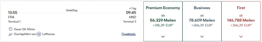 Ähnlich sieht es beispielsweise auf der Strecke nach Tokio aus, wo ab Frankfurt nun 146.788 Meilen fällig werden, wobei der Meilenwert hier “nur” doppelt so hoch ist wie für die Business Class:
