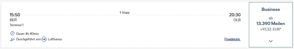 Zwar sollte man unbedingt vergleichen, gerade auf gemeinhin eher teureren Verbindungen lassen sich Meilentickets aber nun für vergleichsweise faire Preise buchen. Nach Sardinien zahlt man an einem beliebig ausgewählten Datum beispielsweise sowohl in der Economy Class als auch in der Business Class moderate Meilenwerte, während bezahlte Tickets bei knapp unter bzw. sogar über 1.000 Euro für einen Hin- und Rückflug liegen: