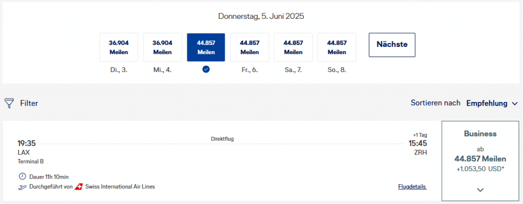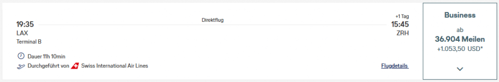 Fraglos ist das neue System bei Miles & More noch in den Kinderschuhen, sodass mit diversen Veränderungen zu rechnen ist. Auffällig ist etwa, dass gerade bei Abflügen in Nordamerika teils kuriose Preise auftreten. In der Economy Class werden auf der Langstrecke teils sogar weniger als 100 Meilen verlangt. In der Business Class sind die Werte teils ebenfalls viel niedriger als bei einem Abflug ab Europa, wie etwa dieses Beispiel eines Fluges von Los Angeles nach Zürich zeigt: