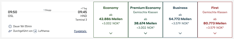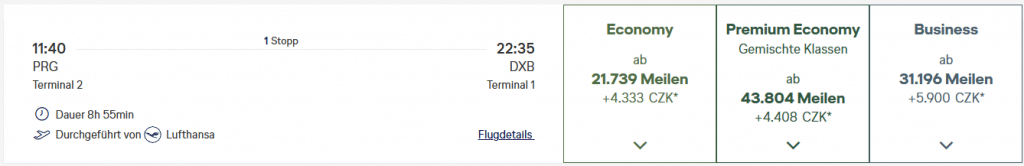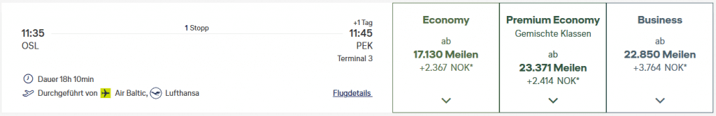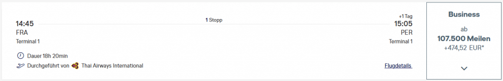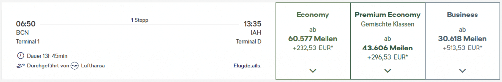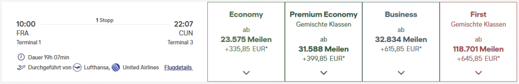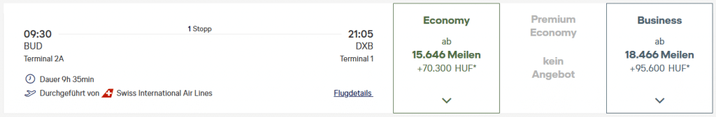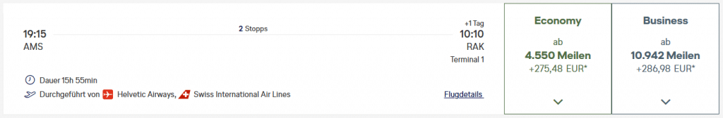 Einige Ziele im Mittelstreckenbereich, wie der Nahe Osten oder Nordafrika, sind unter den dynamischen Preisen ebenfalls attraktiv geworden. Die hier gezeigten Meilenwerte lagen in der Vergangenheit häufig deutlich höher. Zwar sind weiterhin Zuschläge zwischen 150 und 200 Euro fällig, doch der Gesamtpreis ist – selbst inklusive dieser Gebühren – auf vielen Strecken deutlich günstiger als reguläre Ticketpreise.