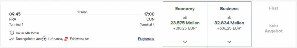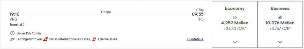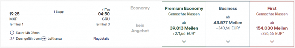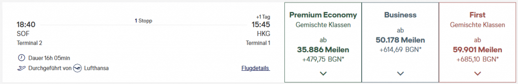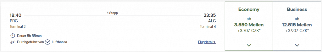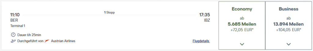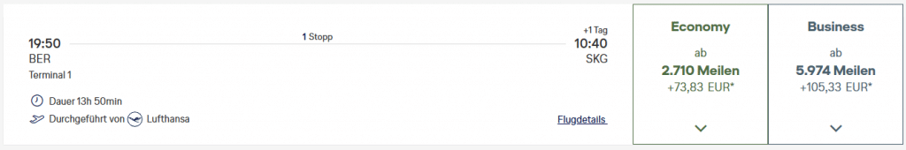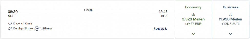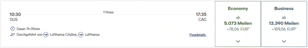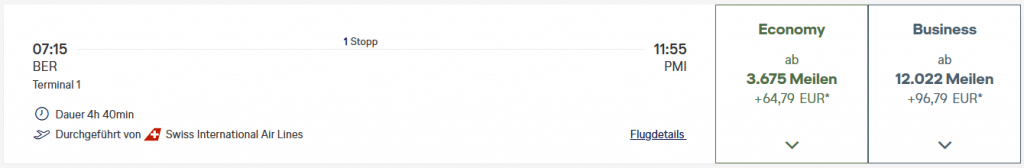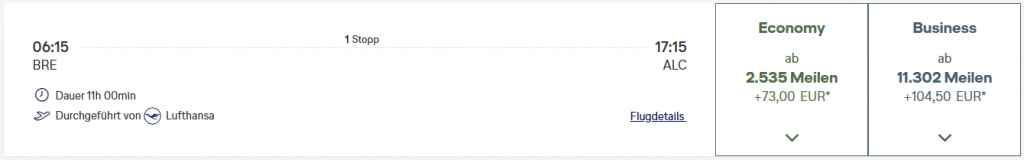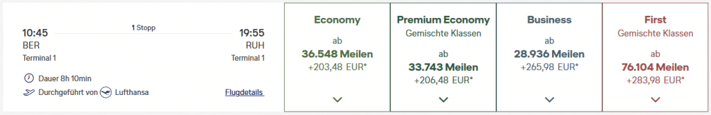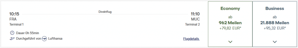 Das sieht man beispielsweise sehr gut an den Rennstrecken zwischen Frankfurt oder Berlin und München. Aber auch Flüge ins nahe europäische Ausland sind teilweise schon ab 2.700 Meilen in der Economy Class oder 5.900 Meilen in der Business Class buchbar – bei guter Verfügbarkeit.