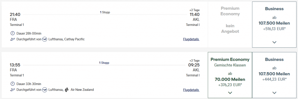 Spannend ist das auch für Awards nach Australien oder Neuseeland, denn selbst hier finden sich im neuen Systeme interessante Verfügbarkeiten – teilweise in einer Kombination aus Lufthansa und einem Partner, teilweise aber auch für reine Partner-Awards: