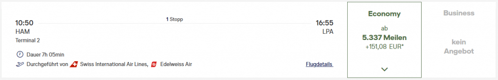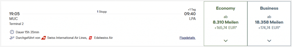 Ein besonders attraktives Beispiel ist ein Flug von Hamburg nach Gran Canaria für nur 5.337 Meilen und circa 160 Euro. Solche Werte waren früher nur mit viel Glück oder im Rahmen spezieller Aktionen möglich – heute sind sie dank der dynamischen Preisgestaltung immer wieder auffindbar. Gerade auf beliebten Reiserouten und in der Saison lohnt sich in Zukunft also ein Blick auf Miles & More, denn unsere ersten Recherchen zeigen teils einen enorm hohen Wert pro Miles & More Meile auf Flügen innerhalb Europas.