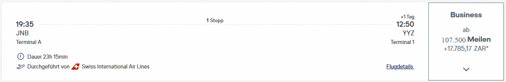Besonders auf Langstrecken in der Business Class gibt es einige spannende Meilenwerte zu entdecken – insbesondere in Richtung Nordamerika. Zu bedenken ist jedoch, dass der Miles & More Flex Plus Award mit deutlich niedrigeren Zuschlägen aktuell nicht buchbar ist. Kurios ist auch die Strecke von Johannesburg über Zürich nach Toronto, alles mit Swiss, jedoch zu einem Fixwert gemäß neuem Award Chart – den Meilenwert haben wir im Übrigen nicht verändert, das wird genau so angezeigt.