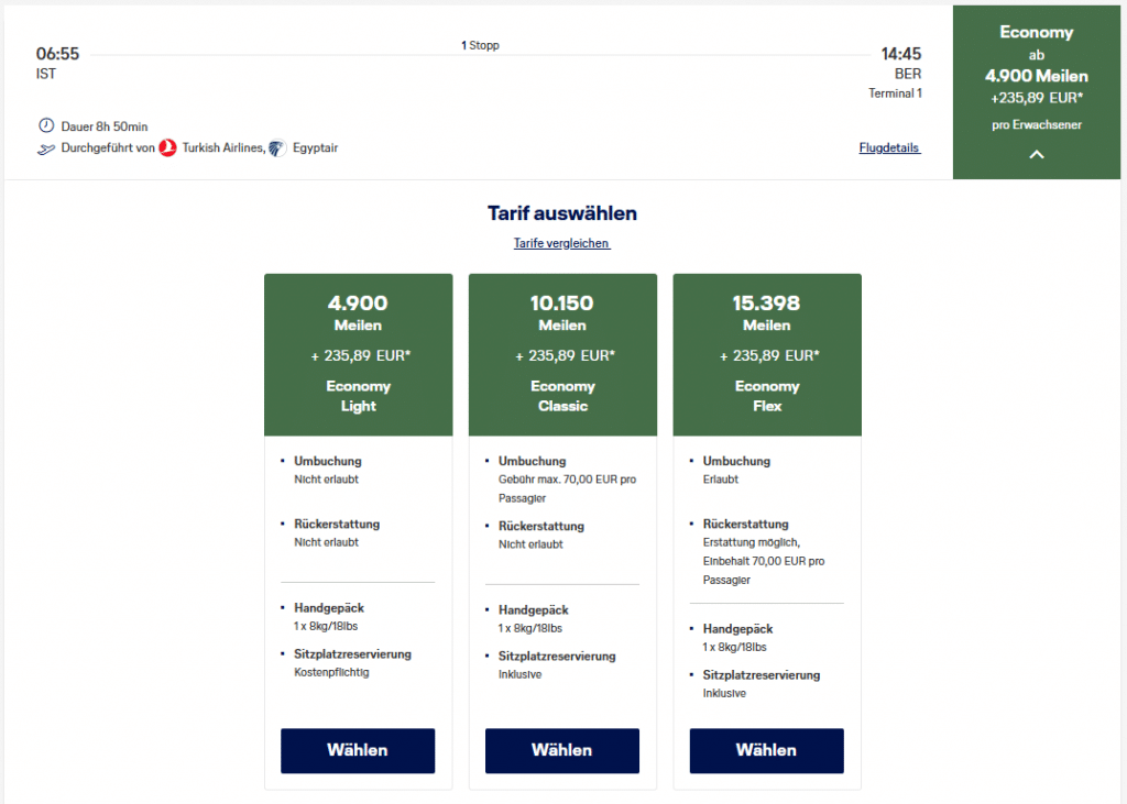 In der First Class wird derweil First Basic angezeigt. Sucht man dann nach First Class Prämienflügen, erscheinen dagegen alle drei Tarife: Basic, Basic Plus und Flex.