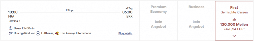 Was uns bei der Recherche in der neuen Miles & More Suche bisher gänzlich nicht begegnet ist, sind Verfügbarkeiten mit Singapore Airlines. Das Star Alliance Mitglied lässt sich bisher nicht auffinden – dafür jedoch einige Verfügbarkeiten beispielsweise mit Thai Airways, auch in der First Class sowie South African Airways.