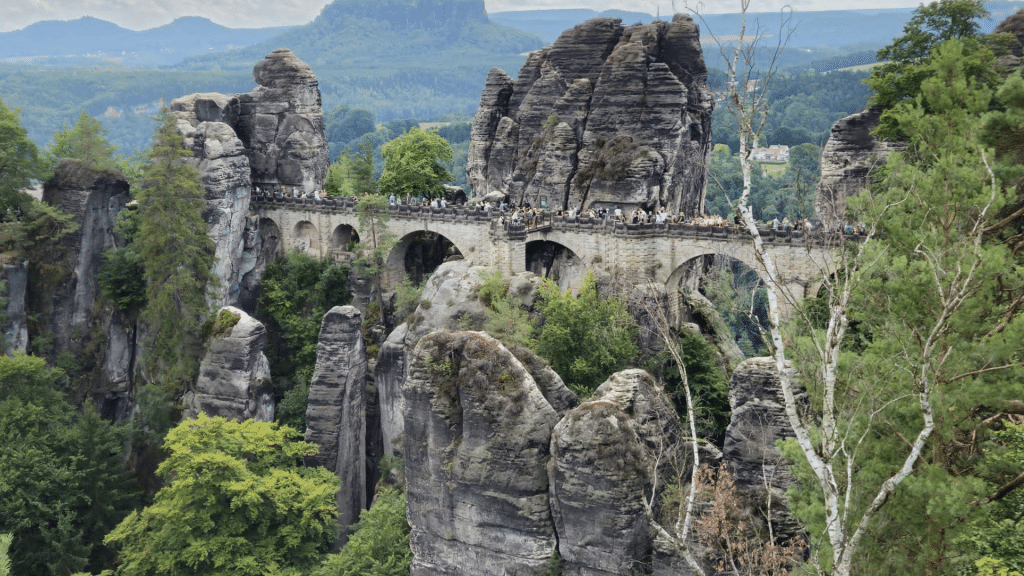 Gegen Mittag haben wir dann die Basteibrücke erreicht und konnten sie von der Aussichtsplattform bestaunen. Da sie eine sehr berühmte deutsche Sehenswürdigkeit ist, waren natürlich Menschen aus aller Welt da, um sie zu sehen. Dadurch war es auf der Brücke an der einen oder anderen Stelle etwas voll. Nach der Brücke verläuft es sich relativ schnell, sodass man ungestört weiter laufen kann. Also absolut sehenswert!