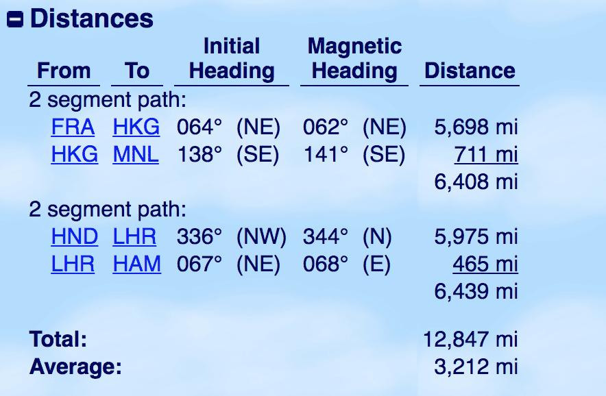 In diesem Fall nutzte ich einen genialen Sweetspot im Cathay Pacific AsiaMiles Programm, der es ermöglicht, ein Ticket mit bis zu 14.000 geflogenen Meilen für 155.000 Meilen in der Frist Class zu buchen. Wie genau das funktioniert, erfahrt Ihr natürlich demnächst noch in einem gesonderte Meilenmagie Guide. Dazu müssen allerdings zwei oneworld Partner Airlines sowie Cathay Pacific auf dem Ticket sein. Diese etwas schwierige Aufgabe löste ich mit einem One-Way Flug in der Cathay Pacific First Class von Frankfurt über Hongkong nach Manila und einem Rückflug in der Japan Airlines First Class von Tokio nach London und anschließend weiter mit British Airways nach Hamburg. So hatte ich die drei Airlines abgehakt und blieb trotzdem unter dem relevanten Schwellenwert von 14.000 Meilen.