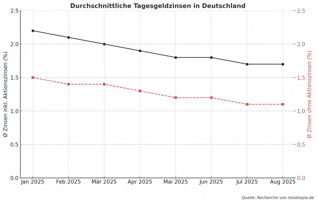 Die durchschnittlichen Zinsen für Tagesgeldkonten sowie Festgeldkonten richten sich grob nach der Entwicklung der EZB-Leitzinsen, die bis ins Jahr 2022 für eine lange Zeit negativ oder auf der Nulllinie lagen. Zum Jahreswechsel 2023/2024 stieg der Leitzins und damit auch das Zinsniveau teilweise auf bis zu 4,5 Prozent. Seitdem ist das Zinsniveau rückläufig. Seit dem 5. Juni 2025 liegt der Leitzins bei 2 Prozent.