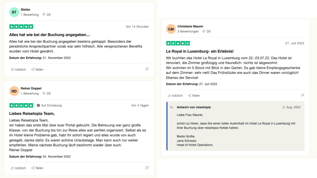 Das erste Beispiel geht doch sogar sehr deutlich auf reisetopia ein, oder nicht? Dass sich Bewertungen auch teilweise auf die von uns empfohlenen Hotels beziehen, finde ich zudem gar nicht problematisch, zumal die Mehrheit der Bewertungen explizit unseren Service beschreibt.